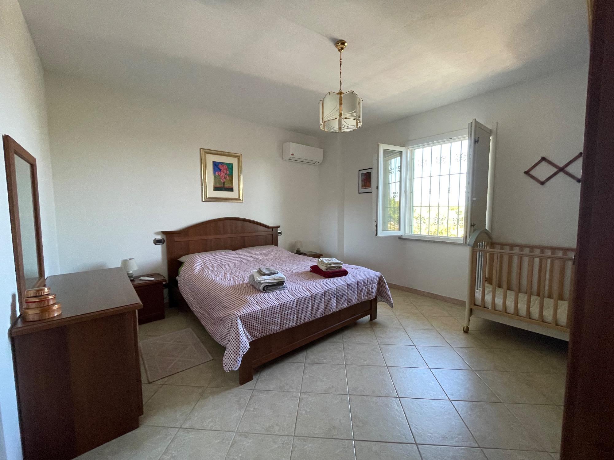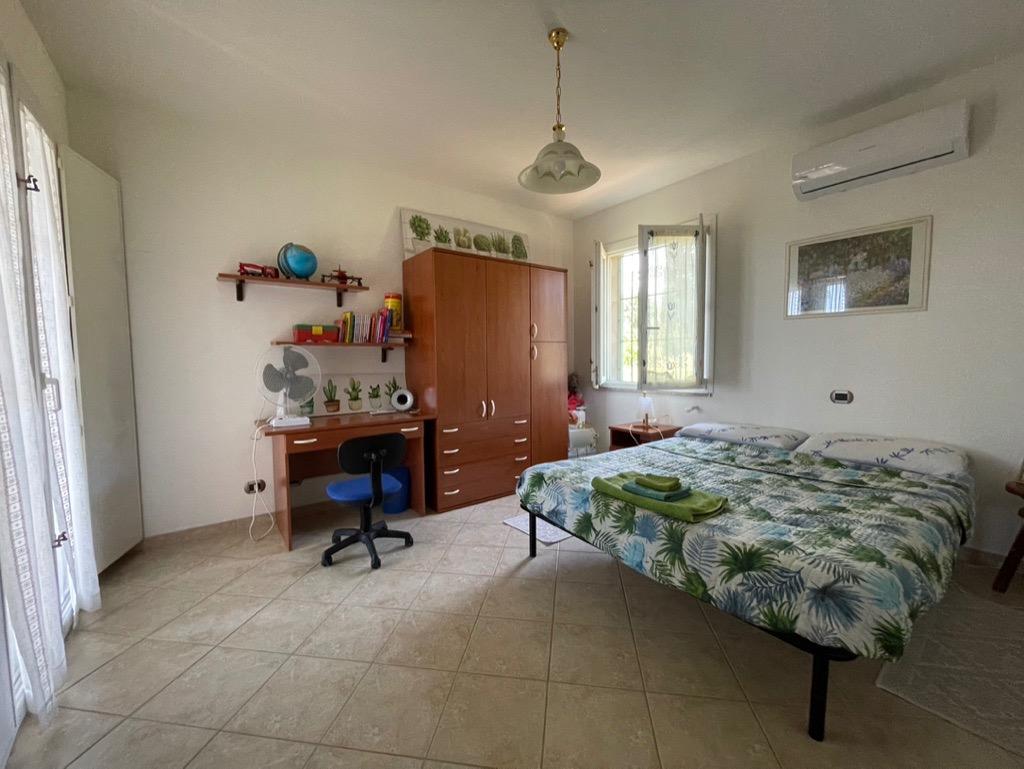 Il giardino, completamente recintato e accessibile tramite cancello elettrico, circonda l’intera abitazione ed è arricchito da una pineta, palme e una lunga fila di oleandri. Al piano terra si trovano un ampio soggiorno-salotto, un bagno e un cucinotto ben attrezzato con piano a induzione. Una scala a chiocciola collega la zona giorno al piano superiore, dove si distribuiscono tre camere da letto luminose e un secondo bagno.